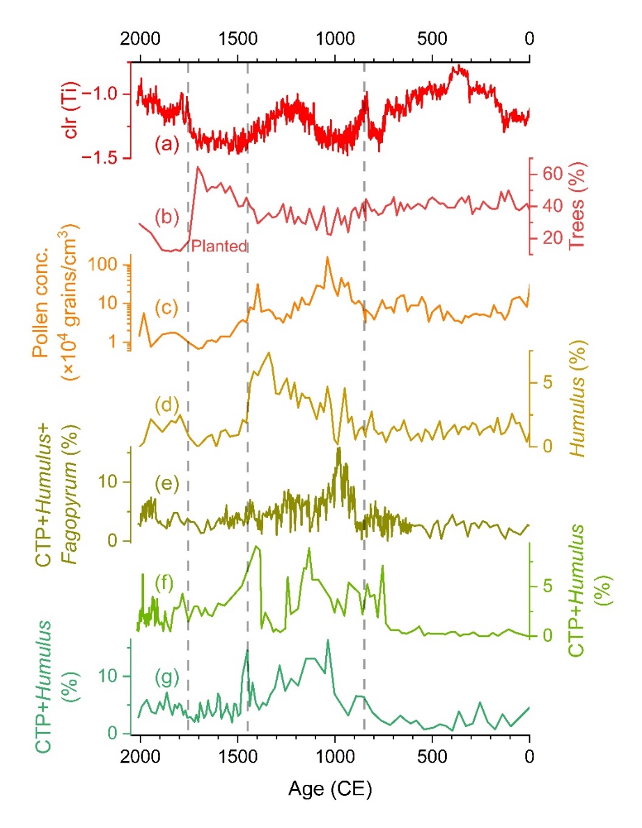 利用对土壤侵蚀非常敏感的元素(如钛,Ti)作为指标,发现土壤侵蚀的强度与植被覆盖度密切相关。在森林覆盖度最低的时期,土壤侵蚀较为强烈。在植树造林期,土壤侵蚀强度降至过去2000年来的最低水平。
