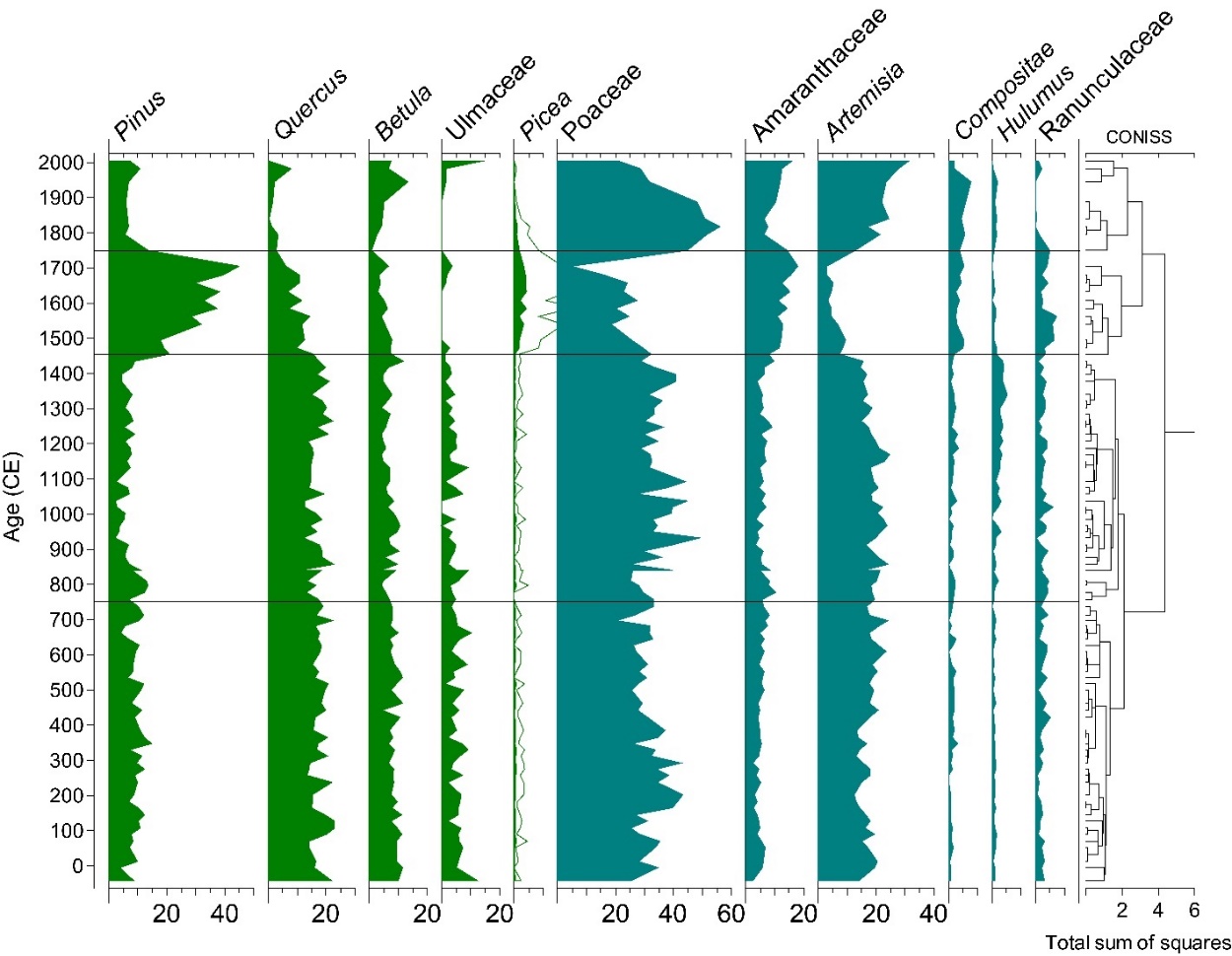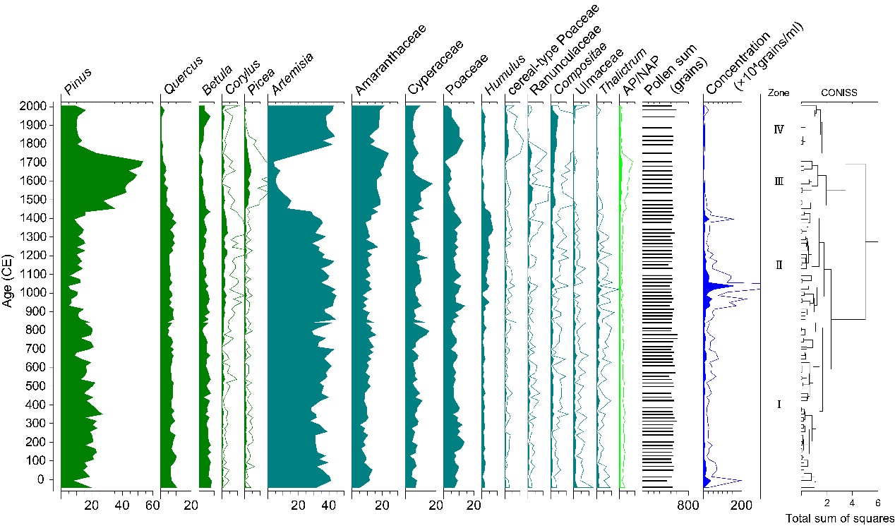 阶段 I (公元前40年 – 公元850年):以草原景观为主,混合部分林地。阶段 II (850 – 1450年):乔木花粉(尤其是松树)减少,表明森林覆盖度下降,人类活动(如农业开发)对植被的影响加剧。阶段 III (1450 – 1750年, 明至清初):松树花粉比例显著提升(从11%升至42.3%),表明当地森林植被大规模恢复。这与周边其他地区森林持续衰退的趋势形成鲜明对比。阶段 IV (1750年 – 现代):森林再次衰退,恢复到以草原为主的现代景观。
