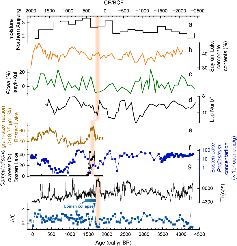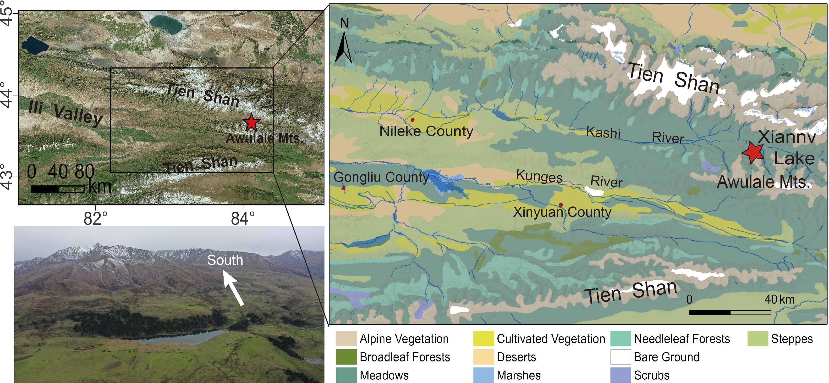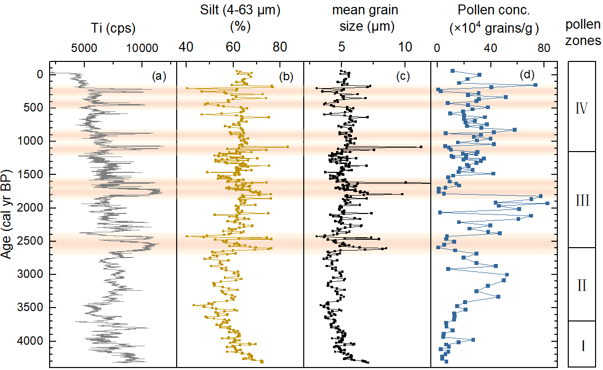 近日,兰州大学研究团队利用天山中部中高海拔仙女湖的高分辨率沉积岩心(XN20D),通过XRF元素扫描、粒度分析和花粉浓度及组合等多指标分析,重建了亚洲中部干旱区4.3 ka以来粉尘活动的历史。研究发现,沉积物粉砂组分增加、花粉浓度显著降低以及干旱类型花粉含量增加与钛(Ti)元素含量升高对应,共同指示低海拔粉尘输入增强,进而识别出七次极端沙尘事件,分别发生在约2.6 ka、1.75 ka、1.6 ka、1.1 ka、0.9 ka、0.4 ka和0.25 ka。西伯利亚高压的增强和西风环流的减弱是导致年代际尺度上盆地沙漠沙尘活动加剧的主要原因。仙女湖记录了发生在约1.75 ka(公元200年左右)的极端干旱与沙尘事件,与天山周围多个区域记录一致,包括博斯腾湖和罗布泊的水位下降、盐度升高和沙尘活动增强。我们推测,1.75 ka前后持续的干旱和高频强沙尘活动,导致塔里木盆地北缘水资源短缺、土地退化,进而导致丝绸之路上的楼兰古城被废弃。