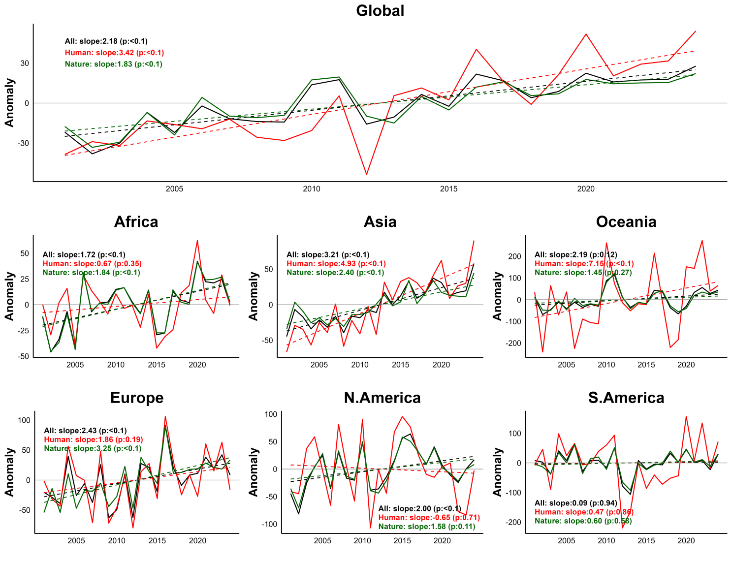 图5. 不同区域与生态系统类型年均GPP的时间变化。黑色:所有生态系统;红色:人类主导的生态系统;绿色:自然主导的生态系统。