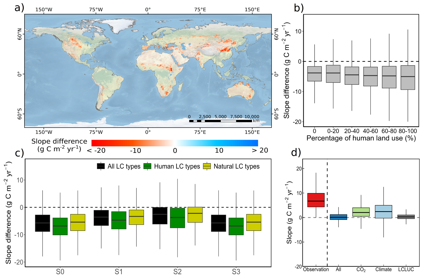 图8. TRENDY模型GPP数据与卫星观测GPP数据在GPP显著增加区域(p < 0.1)的趋势差异分析。a) 趋势差异空间分布图:使用TRENDY多模型集合均值的GPP趋势减去eLUE的GPP趋势;b) 不同人类土地利用(农田+不透水面)面积比例下的趋势差异;c) 不同模拟情景下的斜率差异:S0:未考虑任何模拟因子;S1:仅CO₂;S2:CO₂ + 气候;S3:CO₂ + 气候 + 土地利用与覆盖变化。人类土地利用类型:农田+不透水面;自然土地利用类型:森林+灌丛+草地+稀疏植被+裸地;d) 在GPP显著增加区域(p < 0.1),TRENDY与观测值在不同驱动因子下的GPP趋势比较。