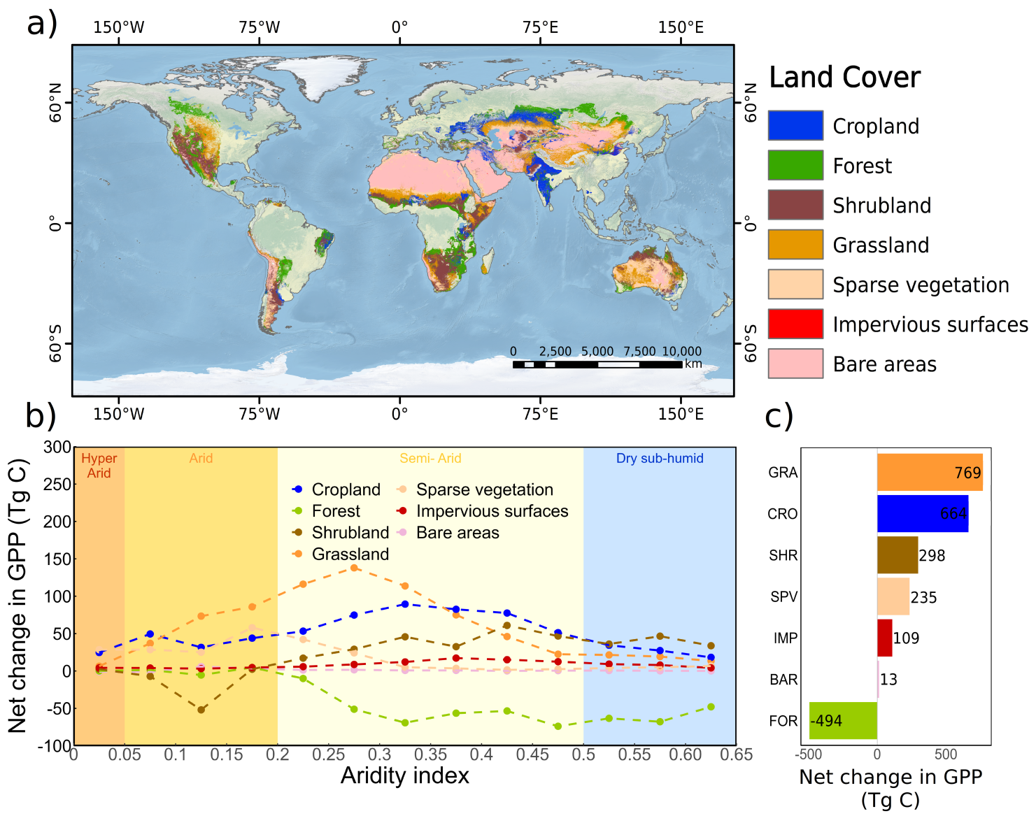 图4. 全球干旱区不同生态系统类型及沿干旱梯度GPP的差异响应。a) 2020年生态系统类型空间分布图。b) 沿干旱梯度不同生态系统类型的GPP净变化量。c) 全球干旱区不同生态系统类型的GPP净变化量。
