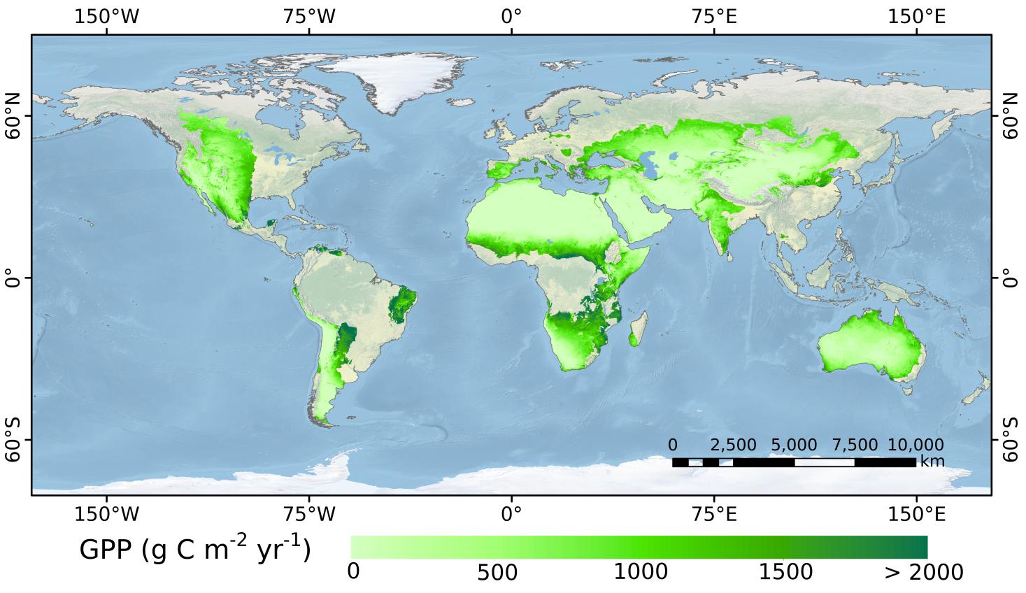 图2. 全球干旱区年均总初级生产力(GPP)的空间格局(2001-2024)。