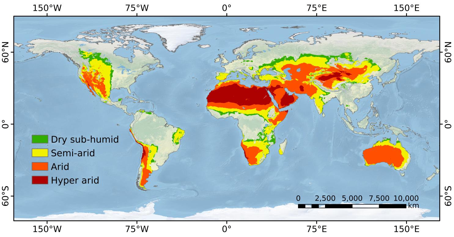 图1. 全球干旱区空间分布及干旱类型划分图。超干旱(Hyper-arid)、干旱(Arid)、半干旱(Semi-arid)、半湿润干旱(Dry sub-humid)。