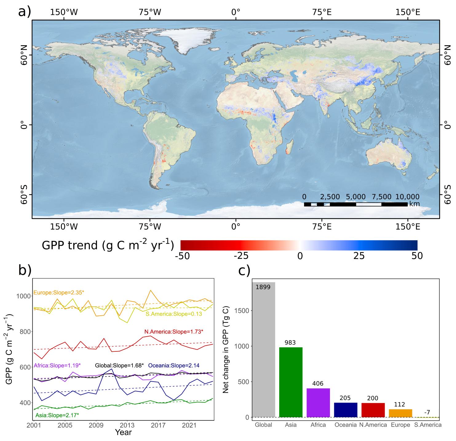 图3. 全球干旱区GPP的时空格局(2001-2024年)。a) 全球干旱区GPP趋势的空间分布。只显示了显著变化区域(Mann-Kendall检验,p < 0.1)。b) 不同区域的年GPP变化趋势,星号(*)表示p < 0.1。c) 不同区域的GPP净变化量。