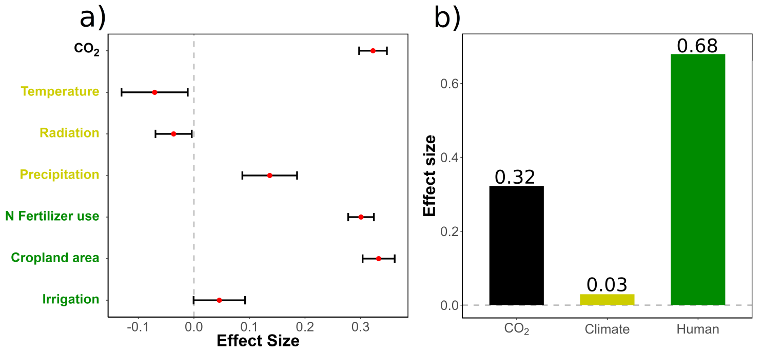 图6. 全球干旱区绿化现象中自然与人为驱动因素的归因分析。a) 在GPP显著增加的区域(p < 0.1),基于偏最小二乘回归模型得到的农田面积、氮肥施用、降水、辐射、温度及CO₂对GPP影响的效应值;b) 将各因子效应值归为三大类别,分别代表推动全球干旱区绿化的主要作用力。