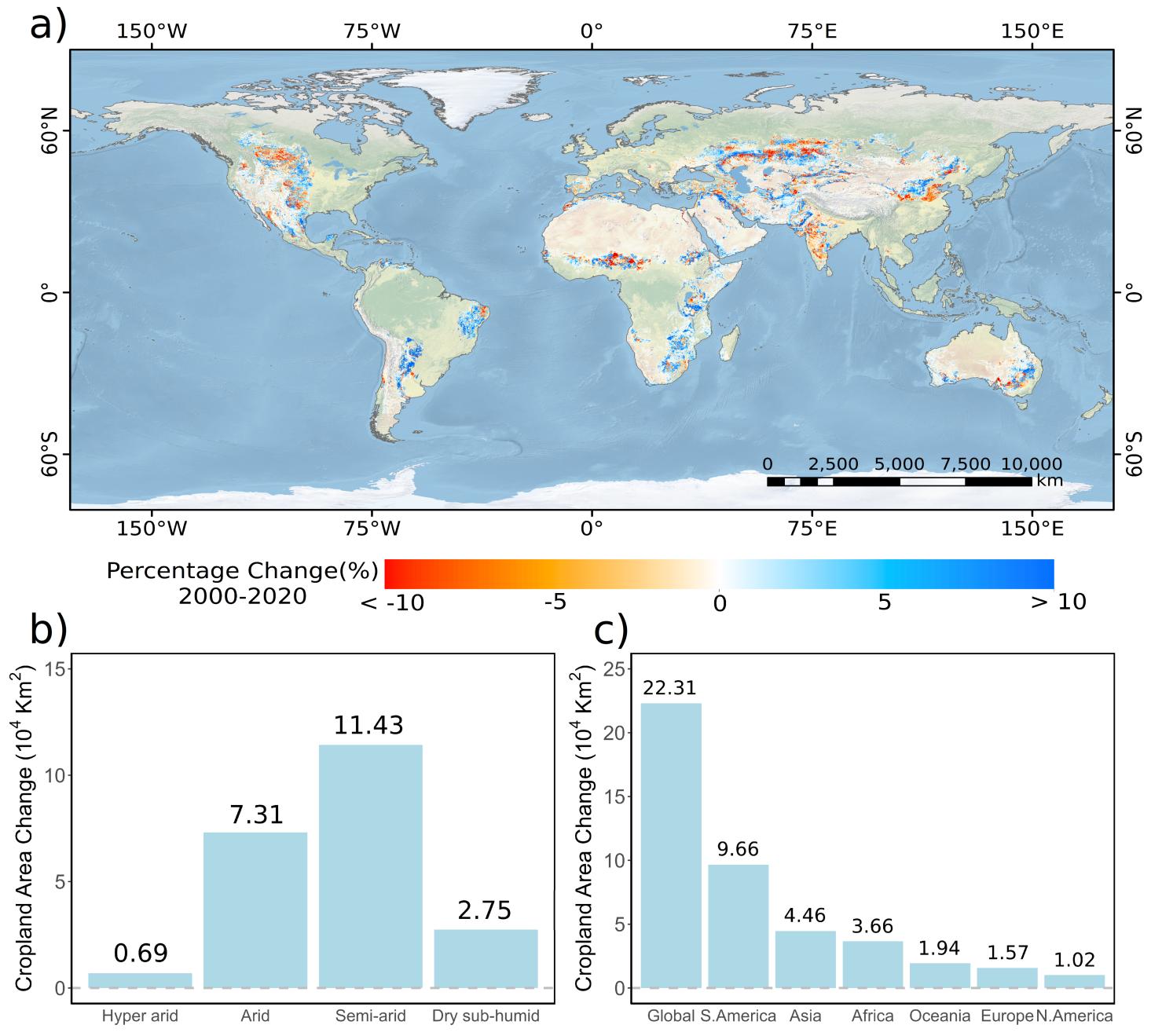 图7. 全球干旱区农田变化。a) 农田百分比变化空间分布(2020年减去2000年)。b) 不同干燥程度下的农田面积变化;c) 全球及不同区域的农田面积变化。