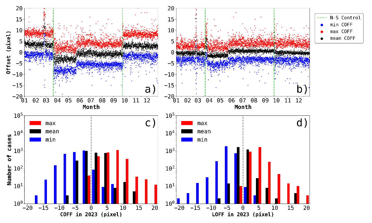 图 10 图示为2023年1月至12月期间,基于FY4B/AGRI全圆盘计算得到的COFF和LOFF最大值、平均值和最小值的时间序列和直方图。上图显示了COFF(左)和LOFF(右)的时间序列,其中垂直的绿色虚线表示主要的南北轨道控制事件。下图显示了这些每日偏移值的相应频率分布。